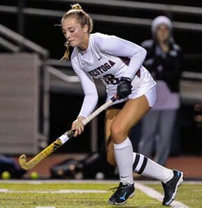 Two field hockey players sitting on a bench ad reads the best of the best choose Longstreth.
